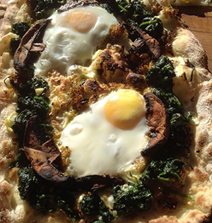 Eggs aren't just for breakfast! In fact, you can put an egg or two onto almost any pizza, as long as you build up a low "wall" from the other toppings, so the egg will be contained in place until it's (just slightly) cooked. When you cut, the runny yolk will mix together with the crust, spinach, and mushrooms. Read more...