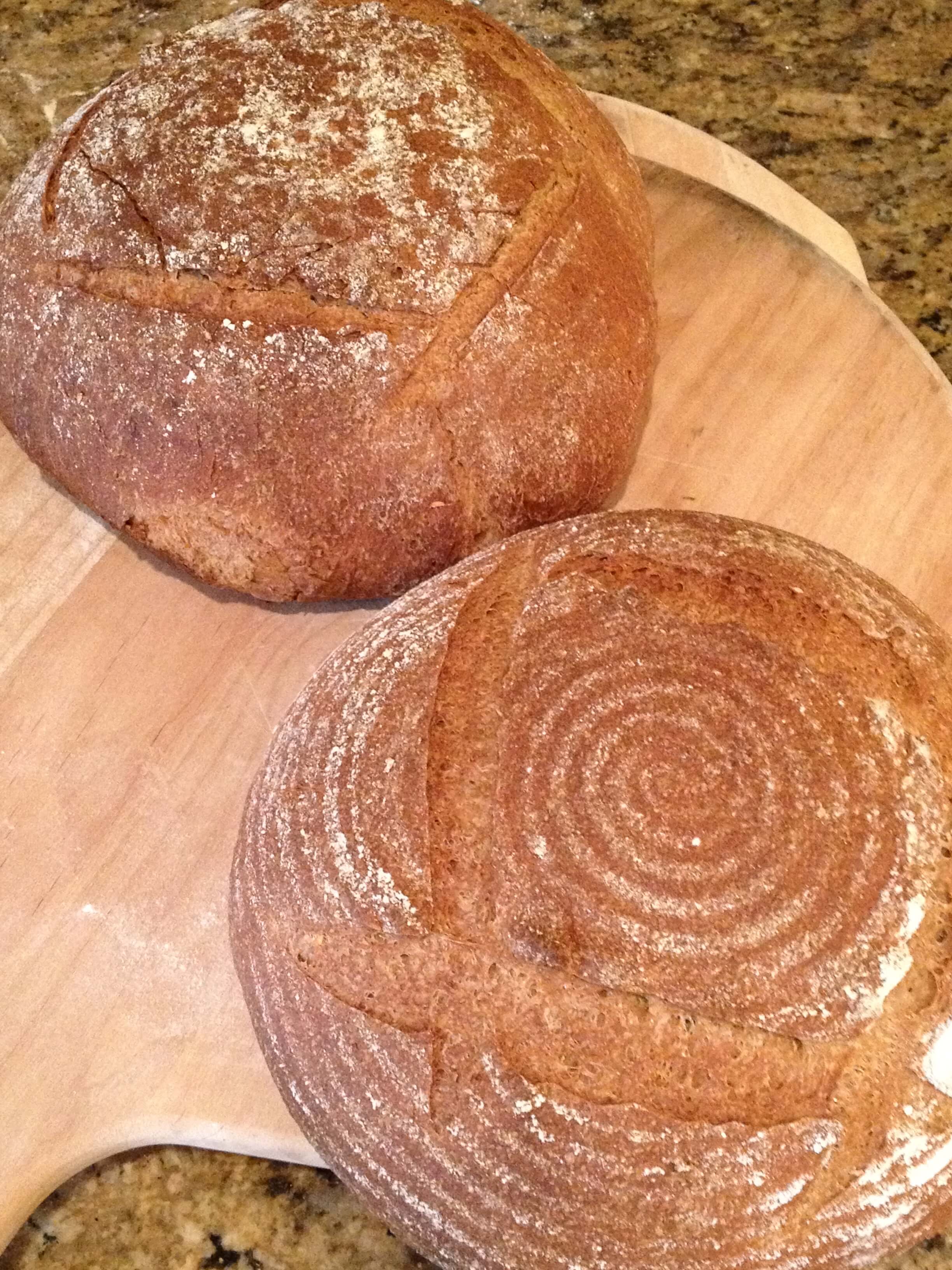 These are two 80% hydration whole wheat oatmeal boules. The dough that killed my KitchenAid Pro 600 mixer. 🙂