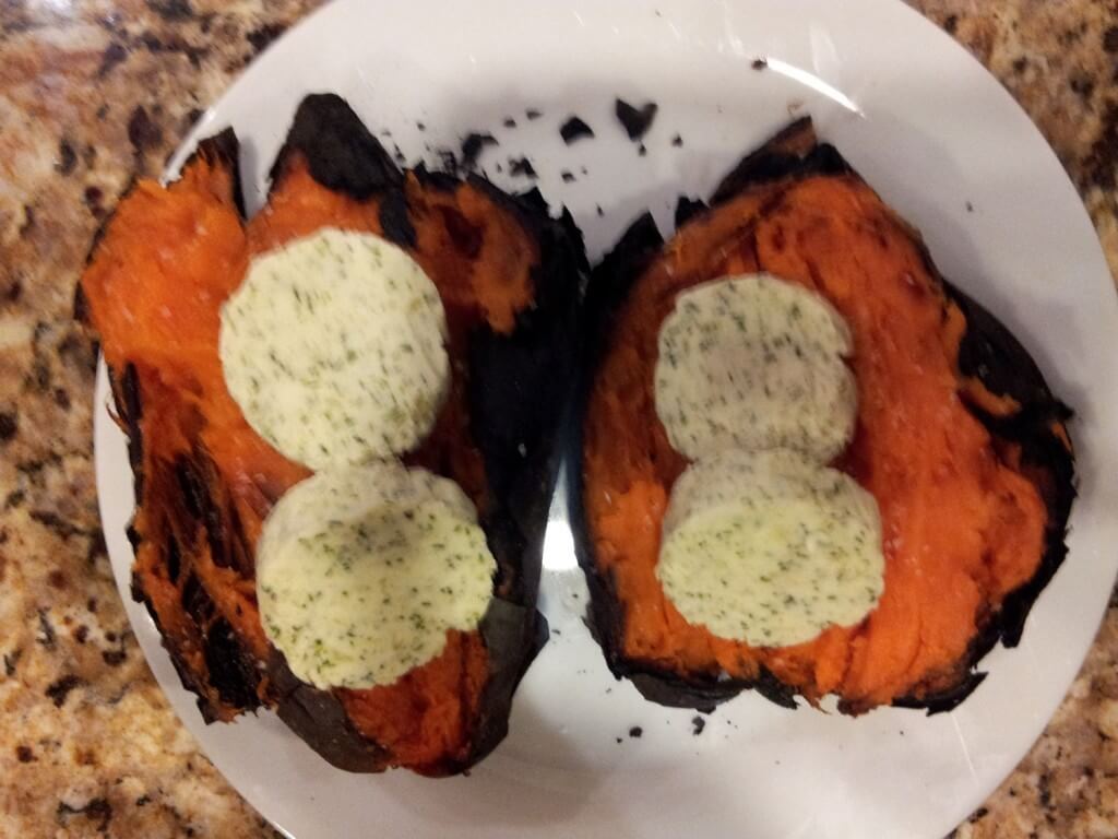 - When the potatoes are soft, remove from the foil. Cut a lengthwise slit in the top of each potato and squeeze them open to expose the brilliant orange flesh. Season with salt and pepper. Remove your butter from the fridge, unwrap it and cut round pats. Place them on top of the sweet potatoes and serve. The rich, slightly smoky sweetness will complement anything savory you’ve roasted in your oven, particularly game meats or turkey.