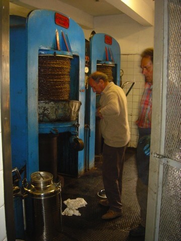 A large hydraulic press slowly pushes up, forcing the olive oil and water mixture down the sides of the disks, into the tray that catches it, and routes it toward the centrifuge, located just to the left of this photo. The two gentleman pictured own a Fattoria (olive groves, vineyards, and winery) and they were watching over everything, tasting their oil, and even carrying containers of olive oil and olives. They were very gracious talking with us through throughout the process.