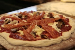 These mushrooms are great! They held their moisture/structure slightly better than if sauteing up some plain, non-marinated mushrooms. They also have a pop of a vinegar brine flavor, which make a nice contrast to the earthy Fontina cheese notes and typical mushroom flavors you’d find on a pizza. The tomato sauce rocks, as always, and the nice, spicy soppressata stands up and says – “Ladies and Gentleman…Right here!”