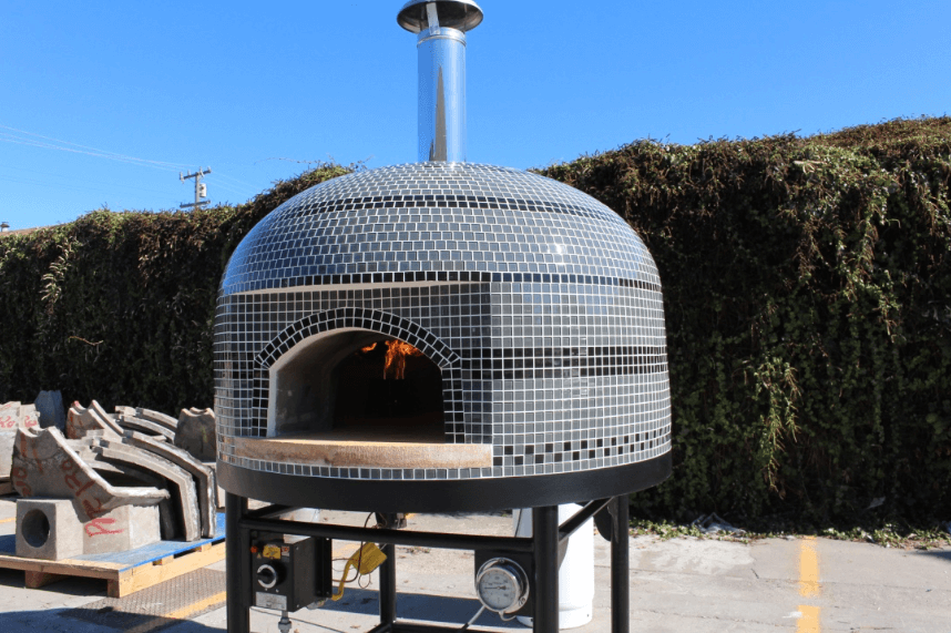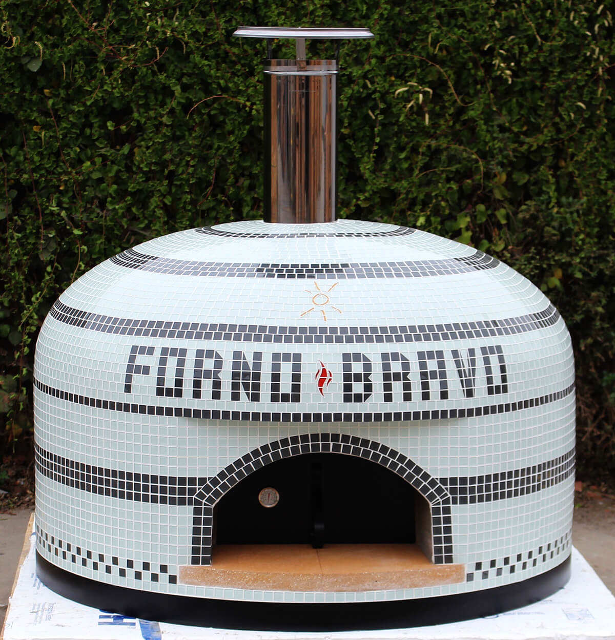 Easily installed by forklift or hoist and can be taken with you when you move. This pizza oven is beautifully hand tiled and customizable to your taste. Available with or without a metal stand, easily mounted on a counter top.
