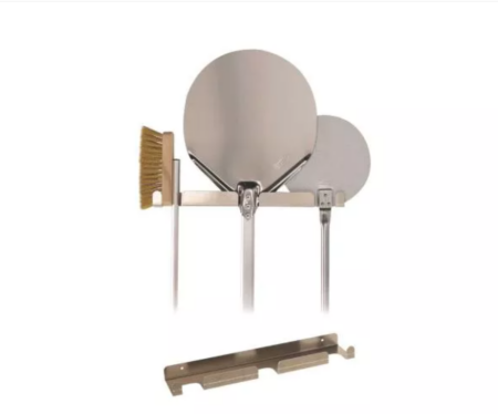 Aluminum wall rack for holding pizza peels and pizza oven tools.